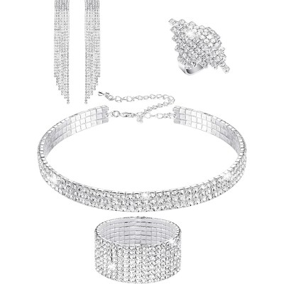 3 Pieces Women Rhinestone Jewelry Set Rhinestone Choker Bracelet Bangle Crystal Necklace Ring Earrings for Wedding