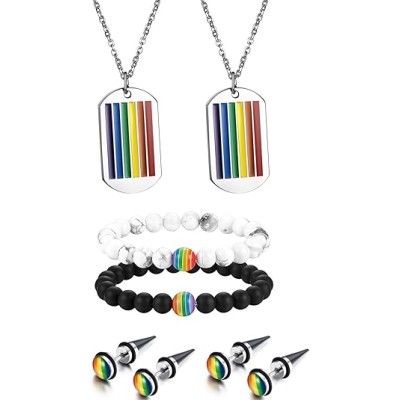 4pcs Gay Pride Lesbian LGBTQ Couples Rainbow Jewelry Set,White Turquoise & Carnelian Bead Bracelet, Stainless Steel Rainbow