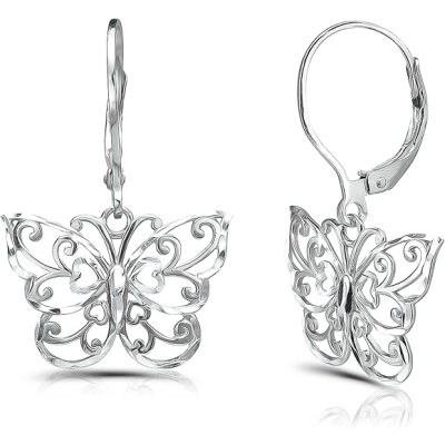 925 Sterling Silver Diamond-cut Filigree Thin Dainty Butterfly Dangle Drop Leverback Earrings