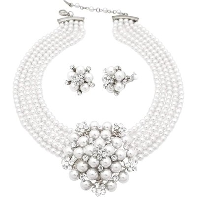 5 Rows Rhinestone Accented Simulated Floral Pearl Cluster Necklace, Clip on Earring 2 Set