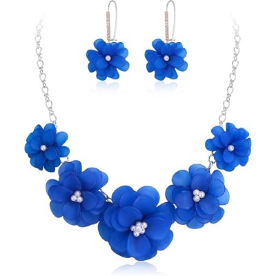 Flower Collar Necklace, Faux Pearl Floral Summer Beach Statement Choker Necklaces Dangle Earrings for Women, Handmade Fashion