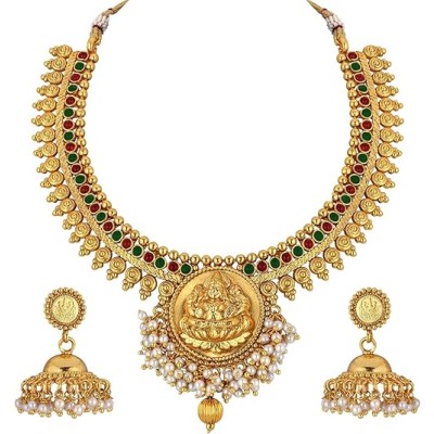 Indian Traditional Temple Necklace Jhmki Jhumka Dangle Earring Set Studded with Faux Stone Bollywood Wedding Jewelry Gift for