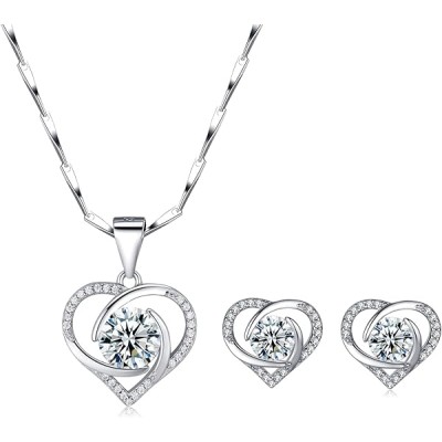 Silver Jewelry Set for women, 925 Sterling Silver Stud Earrings, Love Heart Pendant Necklace with White/Purple/Blue Cubic