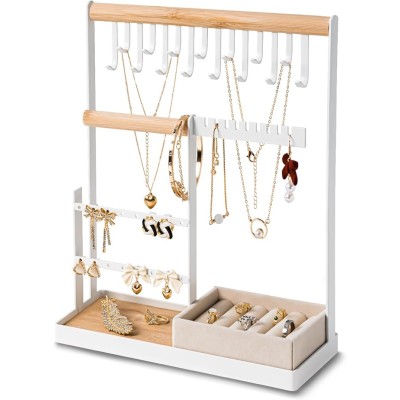 Jewelry Organizer Stand with Velvet Ring Holder, 4 Tier Jewelry Holder Organizer with 15 Hooks for Necklaces and 16 Holes for