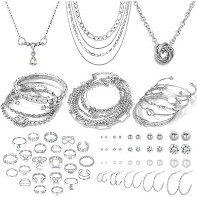36 PC Silver Plated Jewelry Set With 3 Necklace, 12 Bracelet, 7 Ear Cuffs Earring, 14 Knuckle Rings For Women Girls Valentine