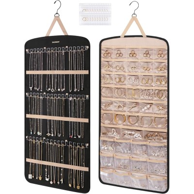 Hanging Jewelry Organizer, Necklace Holder Anti-tangle Earrings Rings Hanger with Pockets Hang on Closet, Wall, Door,1 Piece,