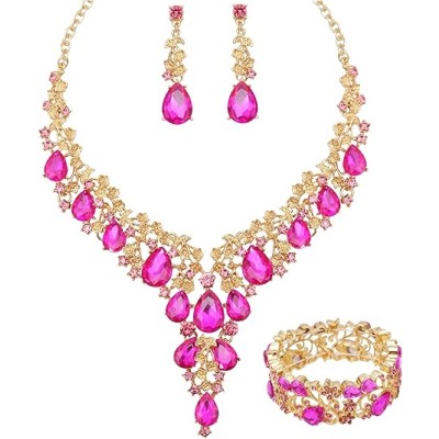 Elegant Crystal Costume Jewelry Sets Flower Bridal Necklace Earrings Stretch Bangle Set for Bride Bridesmaid Wedding Dress