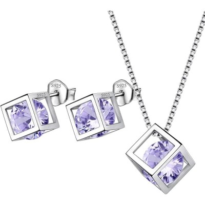 Birthstone Necklace/Earring 925 Sterling Silver Women Cross/3D Cube/Cresent Moon Birth Stone Jewelry Mens Birthday Gift
