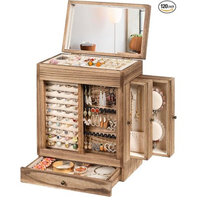 Jewelry Box for Women, 5 Layer Rustic Wooden Jewelry Organizer with Glass Window, 4 Drawers, Mirror, Large Jewelry Storage